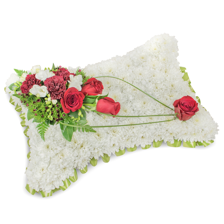 Express your deepest condolences with our stunning sympathy bouquet, meticulously crafted to convey your heartfelt emotions. This unique arrangement features a harmonious blend of white chrysanthemums, red roses, white freesias, dark red carnations, dianthus, and bear grass, each hand-selected for their freshness and vibrant colors.