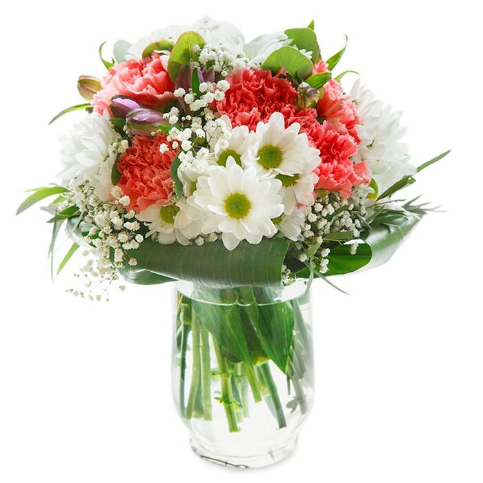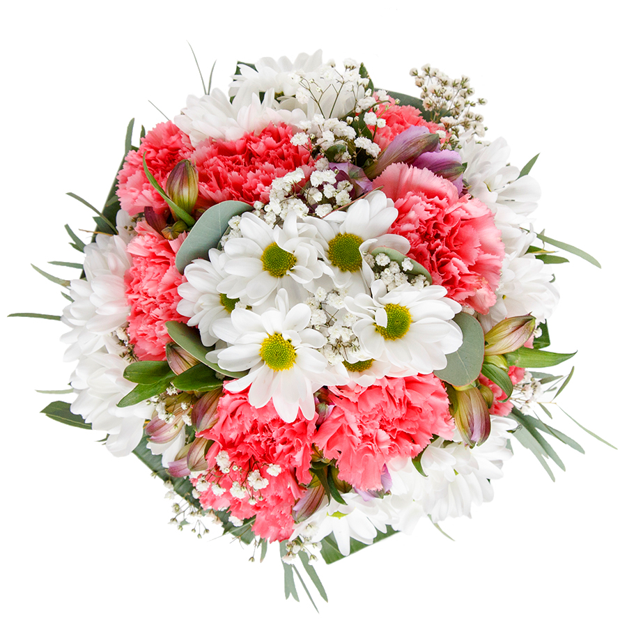 Delight someone special with our exquisite bouquet, a perfect blend of vibrant and soft hues. This unique arrangement features snow-white chrysanthemums, airy gypsophila, charming light pink carnations, and lush aspidistra leaves, each flower hand-selected for unmatched freshness.